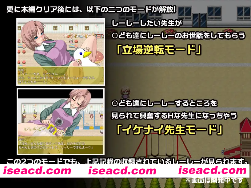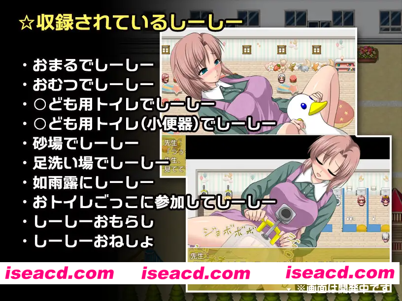 社团名 尿限界社カタルシステム 发售日 2024年05月25日 作者 ビアード 年龄指定 R18 作品形式 角色扮演/有音乐 分类 女主人公 着衣/穿衣 RPG制作大师 ,尿布,尿不湿, 内裤, 失禁, 羞耻,耻辱 ,放尿,小便 故事简介 在幼儿园工作的老师,正为近期孩子们突然频繁出现尿裤子和尿床的问题而烦恼。 有一天,身为巫女的朋友告诉她,她工作的幼儿园里潜藏着怪异。 据说这是一种以人的羞耻心为食的麻烦家伙,孩子们突然重新开始尿裤子、尿床,很可能也是这个怪异搞的鬼。 朋友告诉她,要救孩子们,唯一的方法就是将怪异暂时封入内心纯洁的老师体内,再进行净化。 但是,到了第二天,被净化的怪异会试图随着尿液一起排出体外。 这时,如果老师感到强烈的羞耻,排出的怪异就会恢复元气。 反之,如果老师能堂堂正正地完成排尿,怪异就会就此消失。 第二天,或许是怪异作祟,老师感到尿意,却又陷入无法使用员工厕所的窘境。 究竟,在许多孩子们的注视下,老师能否做到不感到羞耻地完成嘘嘘呢? 游戏玩法 去找嘘嘘的地方吧! 在园内四处走动,寻找嘘嘘的地点,并在那里嘘嘘。 这个游戏里你要做的事情仅此而已。 ☆收录的嘘嘘场景 ・在便盆上嘘嘘 ・在尿布上嘘嘘 ・在儿童厕所(马桶)上嘘嘘 ・在儿童厕所(小便器)上嘘嘘 ・在沙坑里嘘嘘 ・在洗脚池嘘嘘 ・对着洒水壶嘘嘘 ・参加“上厕所过家家”并嘘嘘 ・尿裤子 ・尿床 系统详情 可以嘘嘘的地点会用图标标示出来,所以不会迷路! 尝试各种嘘嘘方式,寻找“不羞耻的嘘嘘”方法吧! 尝试过所有方法后,答案一定会浮现的! 虽然在故事上没有特别意义,但技能中也有小小的互动剧情。 各个角色的状态栏里,也隐含着各种各样的设定。(老师的属性会根据模式改变。) 此外,主线通关后,将解锁以下两种模式! 想嘘嘘的老师让孩子们帮忙照顾嘘嘘 「立场逆转模式」 被孩子们看着嘘嘘而兴奋起来的H老师 「坏坏老师模式」 在这两种模式下,也能看到上述收录的嘘嘘场景。 即使是看过的嘘嘘场景,模式不同氛围也会改变……? ■嘘嘘记录 每个嘘嘘场景都可以随时反复查看! 每个嘘嘘场景的观看次数,可以作为“嘘嘘记录”随时查看! ■回想模式 那个坏掉的“成人用厕所”虽然不能用,但可以在那里幻想嘘嘘的场景。 也就是说,就是所谓的回想模式啦。 ■其他 游戏中虽然没有特别意义,但在状态画面等处也加入了每个角色的设定,可以作为风味文本欣赏。 另外,“技能”也大多没有实际作用,但它们构成了一些小小的迷你情景,也欢迎大家查看哦!