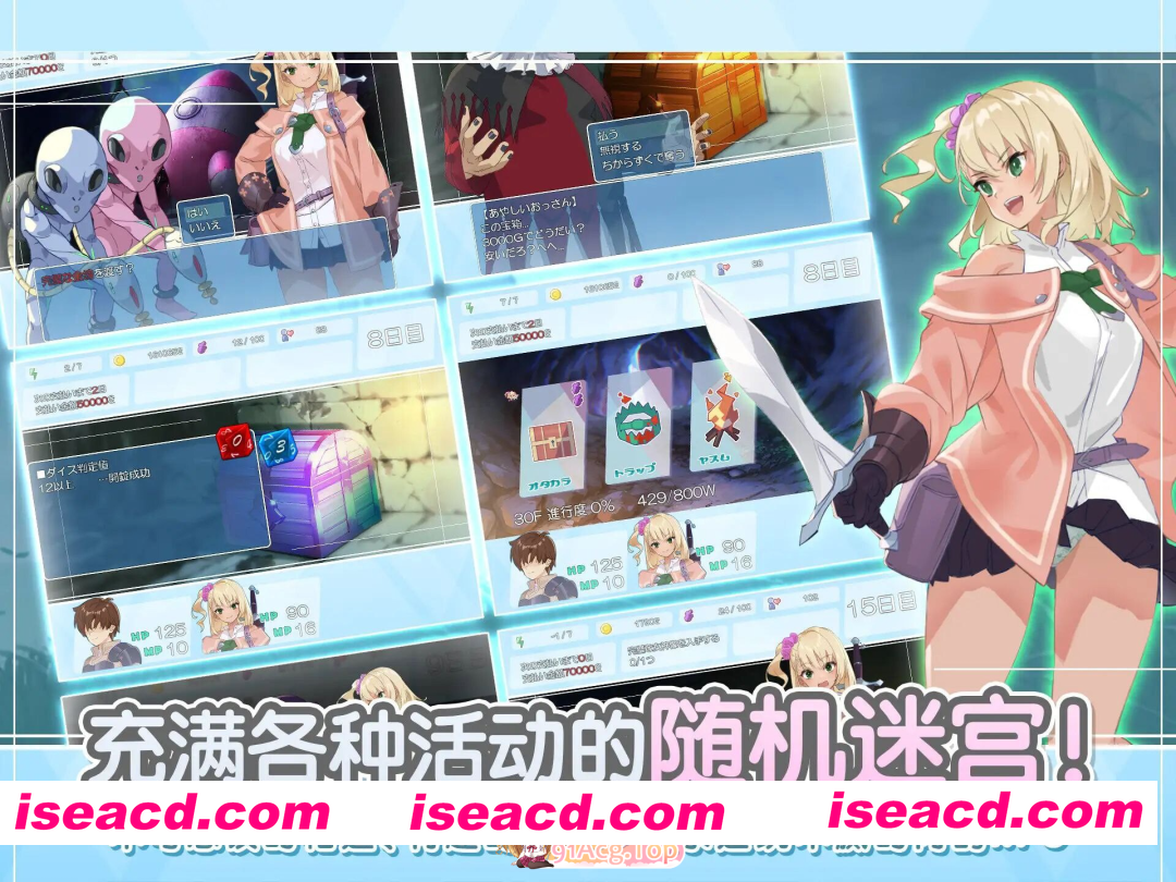 关于此游戏 迷宫――― 那是从比人类历史更为久远的时代就分布在世界各地的神秘迷宫。 里面充满了财宝与魔物,吸引了很多人前来冒险。 有的人是为了名誉,有的人是为了财富,他们不分昼夜地探索着迷宫,很多人命丧于此。 可即便是这样,被迷宫吸引的人们依然蜂拥而至。不久之后,以迷宫为中心的城镇就建成了。 在那之后,经过了一段漫长的岁月。 又有一位青年被未知之境吸引,来到了镇子上。 挑战每次进入都会变化的奇妙迷宫! 通过选择随机触发的事件推进迷宫探索吧。 行动力 在迷宫中触发事件或战斗时会减少,行动力为0时继续行动将受到伤害。 可通过特定道具或事件恢复行动力。 污秽值 污秽值随着迷宫探索逐渐累积,超过阈值就会遭遇「迷宫的恶魔」。 另外,掷骰子时,会从骰子数字扣除当前污秽值约10%的值。 可通过特定事件减少污秽值。 重量 游戏内的物品设有重量。 负重超过上限将无法行动,请及时将物品存入房间里的保管箱, 或出售/丢弃不需要的物品。 天数 在旅馆休息或在迷宫被打败都会推进1天时间,第16天早上将迎来结局。 此外,每隔5天需向公会缴纳费用,请注意按时支付。 掷骰子 迷宫事件的成功与否通过掷骰子判定。 部分装备可提升幸运值,通过增强幸运让骰子更容易掷出大点数,让探险更加轻松吧。 增进与女主角莫妮卡的亲密度吧。 当亲密度提升时,可能会触发特殊事件……!?