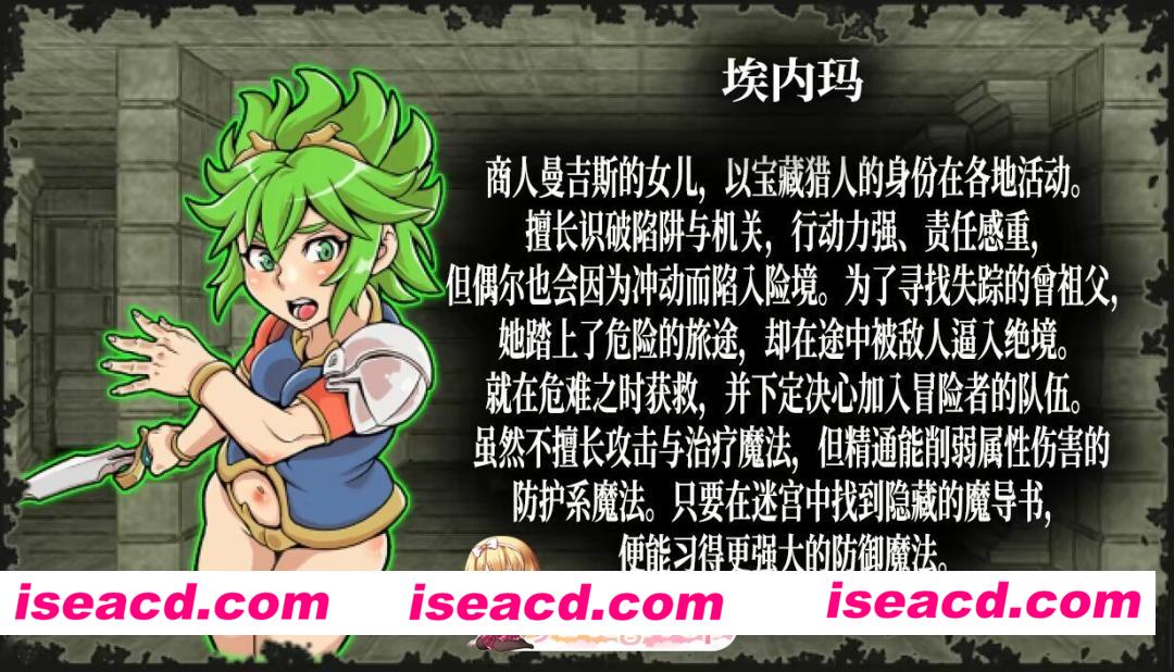 埃内玛 商人曼吉斯的女儿,以宝藏猎人的身份在各地活动。 擅长识破陷阱与机关,行动力强、责任感重, 但偶尔也会因为冲动而陷入险境。 为了寻找失踪的會祖父,她踏上了危险的旅途,却在途中被敌人逼入绝境。 就在危难之时获救,并下定决心加入冒险者的队伍。 虽然不擅长攻击与治疗魔法,但精通能削弱属性伤害的防护系魔法。 只要在迷宫中找到隐藏的魔导书 便能习得更强大的防御魔法。