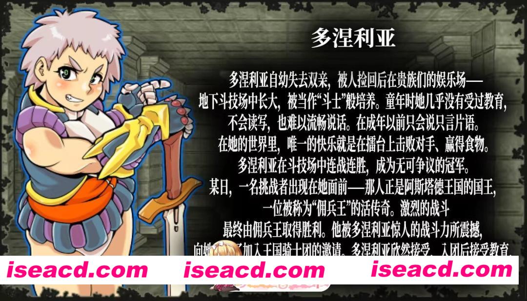 多涅利亚 多涅利亚自幼失去双亲,被人捡回后在贵族们的娱乐场—— 地下斗技场中长大,被当作“斗士”般培养。童年时她几乎没有受过教育。 不会读写,也难以流畅说话。在成年以前只会说只言片语。 在她的世界里,唯一的快乐就是在擂台上击败对手、赢得食物。 多涅利亚在斗技场中连战连胜,成为无可争议的冠军。 某日,一名挑战者出现在她面前——那人正是阿斯塔德王国的国王。 一位被称为“佣兵王”的活传奇。激烈的战斗 最终由佣兵王取得胜利。他被多涅利亚惊人的战斗力所震撼, 向她发出了加入王国骑士团的邀请。多涅利亚欣然接受,入团后接受教育, 在成年之时,她已成长为拥有与常人同等知识的精锐战士。
