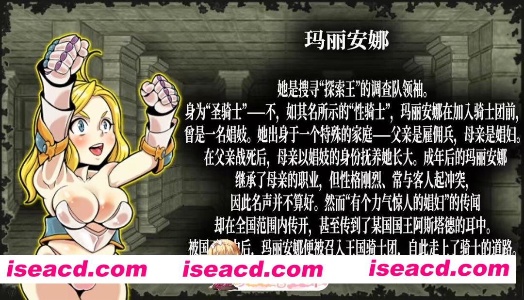 玛丽安娜 她是搜寻“探索王”的调查队领袖。 身为“圣骑士”-—不,如其名所示的“性骑士”,玛丽安娜在加入骑士团前,會是一名娼妓。 她出身于一个特殊的家庭——父亲是雇佣兵,母亲是娼妇。 在父亲战死后,母亲以娼妓的身份抚养她长大。成年后的玛丽安娜 继承了母亲的职业,但性格刚烈、常与客人起冲突,因此名声并不算好。 然而“有个力气惊人的娼妇”的传闻却在全国范围内传开,甚至传到了某国国王阿斯塔德的耳中。被国王看中后,玛丽安娜便被召入王国骑士团,自此走上了骑士的道路。