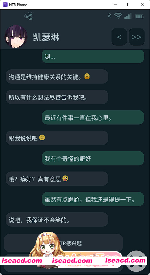 通过本应用与各类女孩聊天互动,体验多种结局路线,包括NTR(寝取)、NTS(寝取され)等多样化情节。