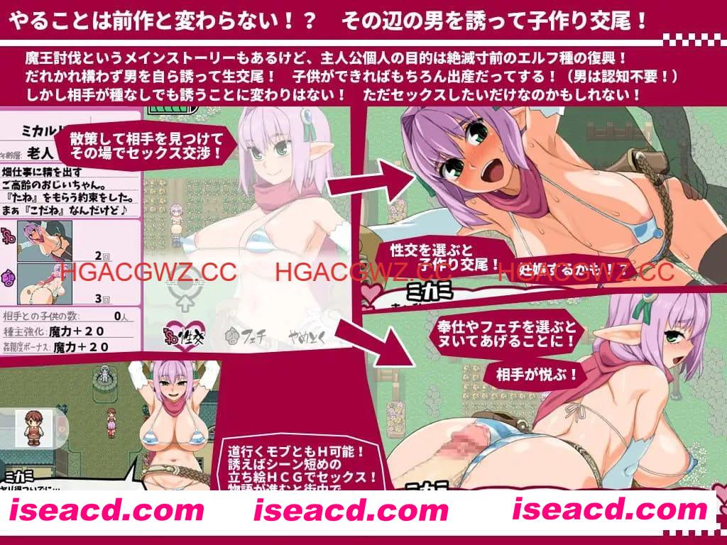 这是一款以痴女(可以毫不夸张地这样形容)精灵女性为主角,在各处进行各种“主动”或“被动”行为的RPG游戏。在前作中作为反派头目的“非人吸血鬼”系列恶魔们,在本作中将成为伙伴,一同展开冒险。关于“行为”本身,与前作相比变化不大。大致就是进行行为、怀孕、生产并感到喜悦的感觉。虽然并非完全没有严肃感或悲壮感,但程度并不深。H场景和对话基本都以轻松的氛围展开。战斗采用简单的回合制侧视角战斗。在战斗过程中也会发生“主动”或“被动”的行为。难度设定较低,但头目战会稍微强一些。在这款游戏中,几乎可与所有登场的异性角色发生H行为。战斗中,如果对手是异性,也会使用H攻击,或者我方也可以主动进行。例外情况包括对主角不感兴趣的角色、无性别的敌人,以及在生产后出现在城镇中的亲生子女等。