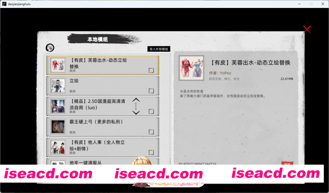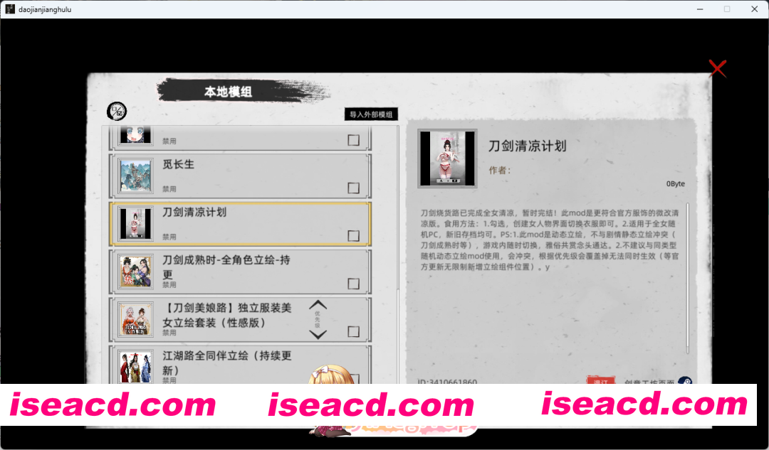 包含了全部角色美化MOD,大量额外女角色MOD(小龙女/杨幂/热巴都有),地牢调教系统MOD/卖春系统MOD等等