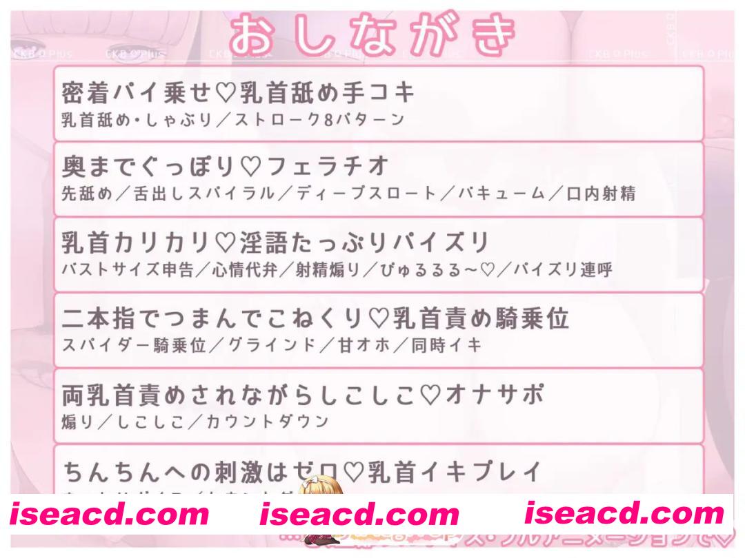入正:https://www.dlsite.com/maniax/work/=/product_id/RJ01494403.html 社团名:#ブランティスト ▫️名称:乳头Ω Plus – 爆乳肉感甜蜜侍奉佐以乳头责罚 – ▫️原名:ちくびΩぷらす-爆乳むちむち甘サド奉仕に乳首責めを添えて- ▫️版本:——— ▫️贩卖日:2026年01月31日 16时 ▫️标签:#SLG #生肉 #PC #CV #动态 #巨乳 #丰满 这是一款在四种基本玩法中“附加”乳头挑逗,以享受乳头刺激乐趣的模拟器。 此外,还搭载了让女孩专注于乳头挑逗的“手淫辅助”模式,以及仅通过乳头刺激引导至射精的“乳头高潮”模式。 没有攻略要素或解锁要素,启动后即可直接享受性爱场景。 全语音 ・为每种玩法、每个阶段准备了多种台词模式。 ・由距离感亲近且狡黠可爱的めるぬ(CV:笹木ころん)献上甜美温柔的言语挑逗。 ・包含低语、淫语、甜腻娇喘、乳交连呼、胸部尺寸宣告、心情代述、倒计时、射精音效(噗噜噜~)等经典台词满载。 特色功能 [结束计时功能] 为解放双手而设计,可在设定秒数后自动迎来高潮。 当然,中途也可切换为手动操作。 [倒计时功能] 在手淫辅助・乳头高潮模式中,高潮时的演出效果之一包含倒计时。 倒计时可以强制触发。 [随机循环播放] 为避免循环单调,将舔舐音、喘息、细语等短片段随机播放。 同时搭载动画随机切换功能,每隔一定循环次数,会自动从所选玩法的所有差分中随机切换动画。 内容介绍 基本动画CG:4张 玩法种类:6种 动画差分:50种 出错请更新最新至WINRAR进行或自行修复,码没错本人亲测后上传,码看资源左下方小红字或点我头像看个人签名 关于问题:看见有些不会的小哥哥小姐姐们可以去讨论区看看啦有你们的方法哦~ 将abc后缀改成zip或7z都可以,如自带有压缩后缀则删除.abc即可 https://51acg.buzz/forum.php?mod … p;extra=#pid1713748 迅雷云 FM/迅雷云 阅读全文 资源下载下载价格VIP专享仅限VIP下载升级VIP立即购买 常见问题 解压密码错误?点击查看》PS:如果提示密码错误,推荐使用Bandizip解压或修改后缀为zip 有些人是因为解压密码复制错误,请手动扩选解压密码,不要直接点复制。 0 0