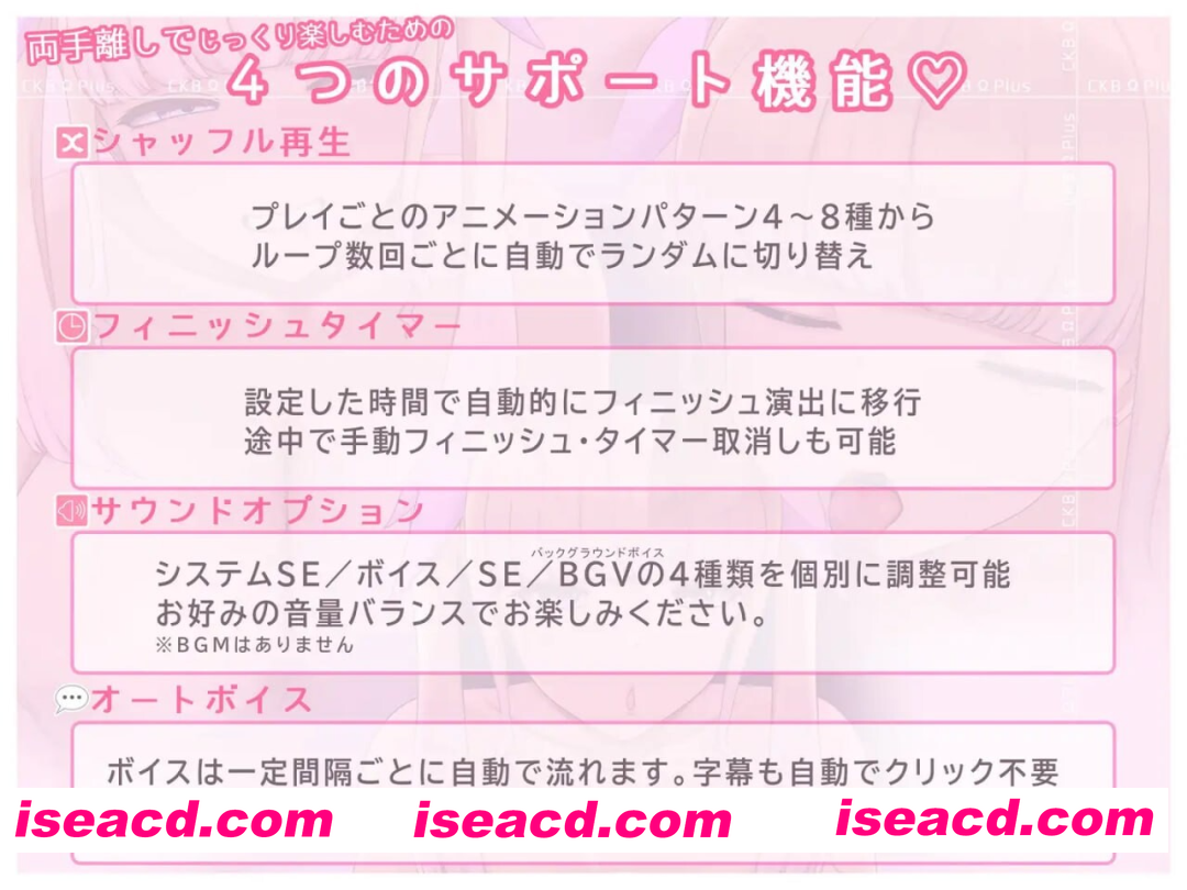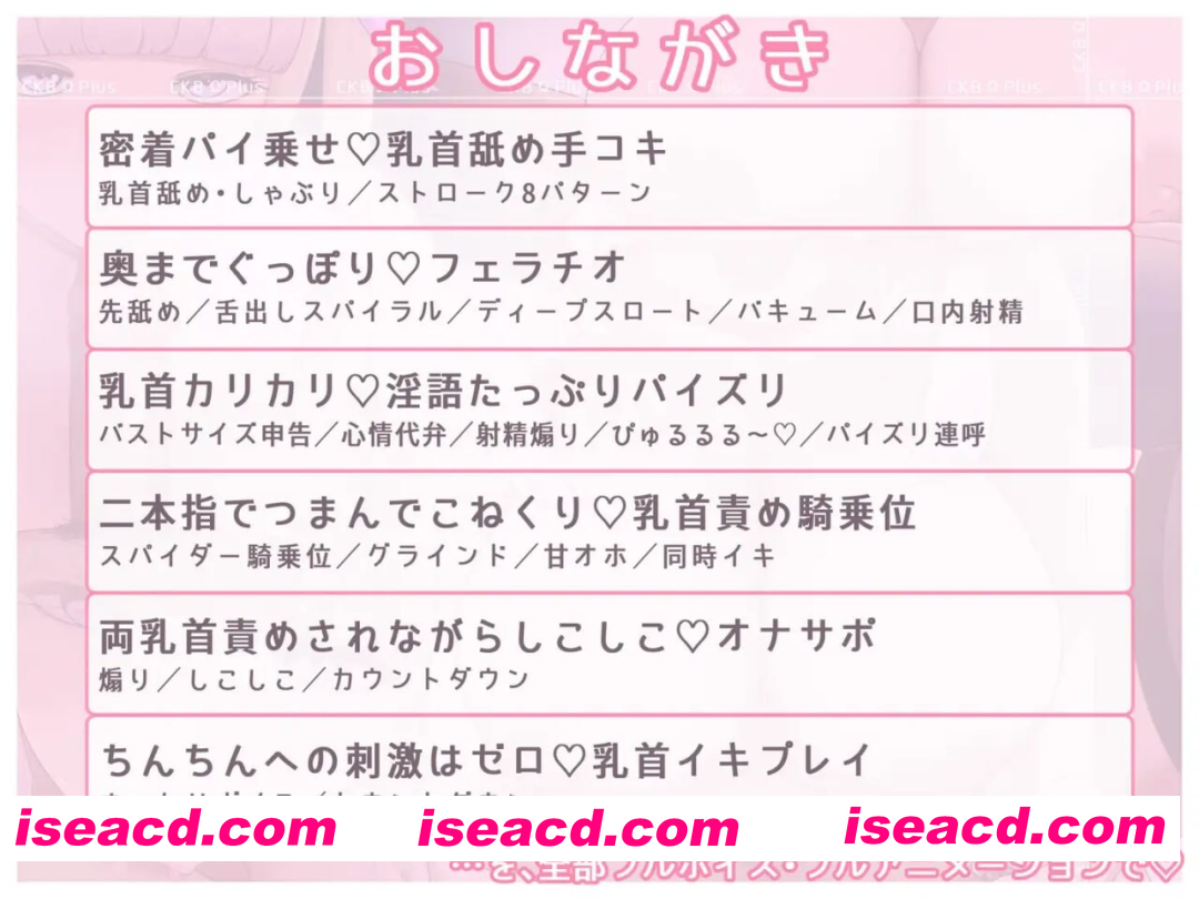 ・包含低语、淫语、甜腻娇喘、乳交连呼、胸部尺寸宣告、心情代述、倒计时、射精音效(噗噜噜~)等经典台词满载。