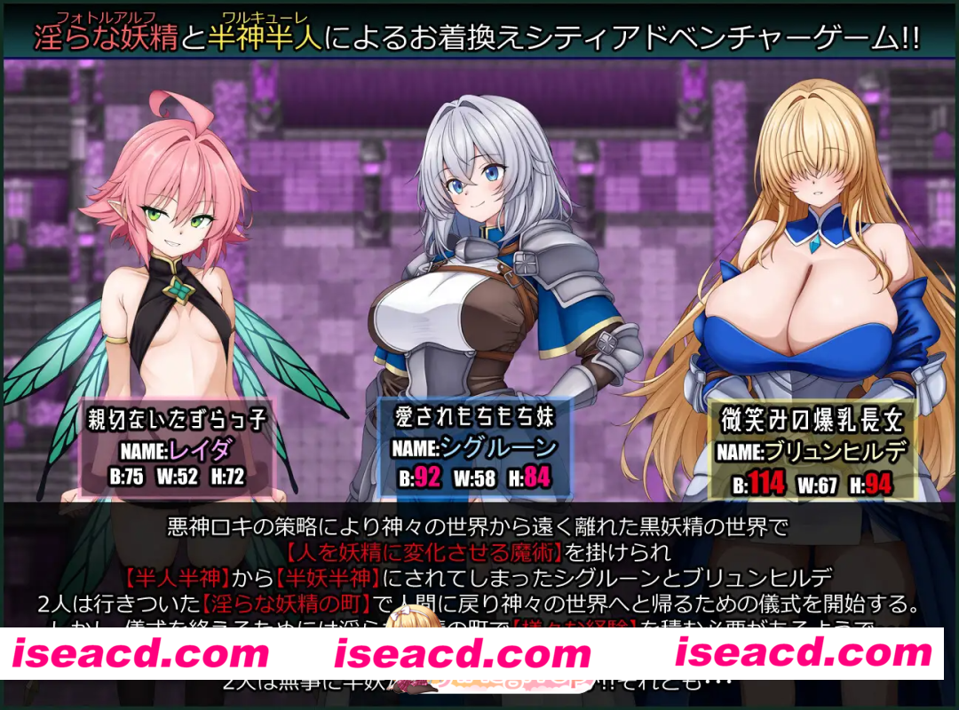 社团名 たのしいたけ 发售日 2026年03月10日 0时 年龄指定 R18 作品形式 冒险、有音乐 分类 女主人公, 连续高潮 ,沉迷,堕落 ,百合 ,高潮脸,阿黑颜,羞耻,耻辱, 露出, 巨乳,爆乳,冒险 作品内容 ■关于秘籍房间■ ※原则上不建议在通关前使用,游戏通关后会自动解锁。 ※使用秘籍房间可能会发生预料之外的BUG。使用时请自行承担风险。 ※在秘籍房间可以[解锁全部H场景回想]・[调整混沌值/发情值]・[获得大量兑换券]。 通关前解锁秘籍房间的条件:[调查蕾达的店铺1F]的壁炉约30次,即可进入秘籍房间。 ■内容■ 标题: 战乙女与淫乱妖精的小镇 类型: 色情换装城市冒险游戏 HCG张数: 基本色情CG 25种 + 差分 100种以上 立绘张数: 主人公1人:可换装服装6种 + 事件限定服装1种 副女主角2人 + 事件限定服装差分 数种 ■故事(剧情简介)■ 作为奥丁臣下的战乙女,希格露恩和布伦希尔德,在与英灵们训练的过程中,恶神洛基突然出现在她们面前。 洛基为了实现自己的目标”让神妖精化”,其第一阶段打算利用”半神半人”的战乙女们。 他以压倒性的力量制服了她们,并将她们带往了某处。 洛基将两人带到了远离众神世界的黑暗妖精世界的边境之地, 并对身为半神半人的战乙女二人,施下了”淫乱妖精的小镇”中流传的魔术——”将人类妖精化的魔术”。 战乙女二人虽然奋力抵抗妖精化的魔术, 但由于连同魔术一起被植入的、拥有扭曲世界之力的”原始混沌”的力量,妖精化魔术最终还是成功了。 二人的”一半”从”半人”变成了”半淫乱妖精”。 就在洛基的魔爪企图进一步伸向她们时,奥丁的使魔出现,击退了洛基,救出了两人。 然而,半神半妖这种扭曲的存在,无权返回众神的世界。两人被迫只能凭自己的力量”变回半神半人”。 为了达成目的,她们前往附近的”淫乱妖精的小镇”,目标是使用在那里得知的”将妖精变回人类的魔术”。 并且,她们需要收集施展魔术所必需的”七个魔术结晶”。 但是,她们发现,要获得魔术结晶,必须在”淫乱妖精的小镇”中,通过各种各样的”体验来获得强烈的情感”。 究竟,原为战乙女的两人能否在这”性之小镇”的体验中保持自我,成功施展魔术,重返”战乙女”之位呢? 还是会被混沌吞噬,彻底堕落为”淫乱妖精”呢?她们的命运将何去何从!? ■登场人物■ ○希格露恩 [战乙女中充满活力的可爱幺女] 身高:156cm 三围:B92・W58・H84 战乙女中最小的妹妹,负责瓦尔哈拉的英灵培养工作。 性格活泼可爱,因此被英灵们当作妹妹一样对待。 不太擅长动脑,但活动身体是她非常擅长的领域。 因此,她最尊敬众多姐姐中头脑清晰的布伦希尔德。 虽然她还很不成熟,但因为她很努力,所以也受到姐姐们的赞赏和支持。 被洛基的魔术从半神半人变成了半人神半妖。稍微有点抖M倾向,弱点是整个私处。 ○布伦希尔德 [战乙女中可靠丰满的大姐姐] 身高:169cm 三围:B114・W64cm・H91 战乙女们的长女,同时也是创造出她们的主神奥丁的秘书。 她那丰满身体的性感以及魔术的造诣,在战乙女中也是出类拔萃的, 妹妹们对她充满尊敬,瓦尔哈拉的英灵们则向她投以炙热的目光。 运动方面稍显不擅长,但智力方面非常优秀,是可靠的作战参谋。 对性事方面较为生疏,妹妹们担心她会否被坏男人抓住。 被洛基的魔术从半神半人变成了半人神半妖。 有相当程度的抖M倾向,弱点是整个胸部。 ○蕾达 [亲切又爱恶作剧的淫乱妖精] 身高:130cm 三围:B75・W52・H72 住在淫乱妖精小镇的妖精女孩子,自称用”僕”(男性自称,但常用于假小子/可爱女孩)。 平时总是飘忽不定,喜欢通过搞H的恶作剧来享受每一天。 但另一方面,她对遇到困难的妖精很亲切,且爱管闲事。 是个行动派,一旦决定做什么就会立刻付诸行动。 在妖精小镇独自经营着一家让人达到高潮的店(イかせ屋),是个技巧派。 有相当程度的抖S倾向,尤其喜欢看女孩子达到高潮时的表情。 ■色情事件■ 本作的色情事件可以通过满足主人公们的状态条件,[寻找小镇中招募的工作]或[隐藏的事件]等来触发。 主要的色情元素如下: ‘爆乳・巨乳’ ‘色情服装’ ‘连续高潮’ ‘阿嘿颜’ ‘淫乱化’ ‘刺激阴蒂’ ‘潮吹’ ‘刺激乳头’ ‘母乳・射乳’ ‘蕾丝・百合’ ‘羞耻’ ‘拘束’ ‘淫语’ ‘全裸徘徊’ ‘丢脸色情’ ‘快感堕落’ 等构成。 从表情紧绷的瞬间,到敏感部位被玩弄时表情瞬间松弛,最终露出阿嘿颜,洒出H体液的女孩们!! 特别推荐给想要欣赏这种反差感的玩家!! 作弊码365358 阅读全文 资源下载下载价格VIP专享仅限VIP下载升级VIP立即购买 常见问题 解压密码错误?点击查看》PS:如果提示密码错误,推荐使用Bandizip解压或修改后缀为zip 有些人是因为解压密码复制错误,请手动扩选解压密码,不要直接点复制。 0 0