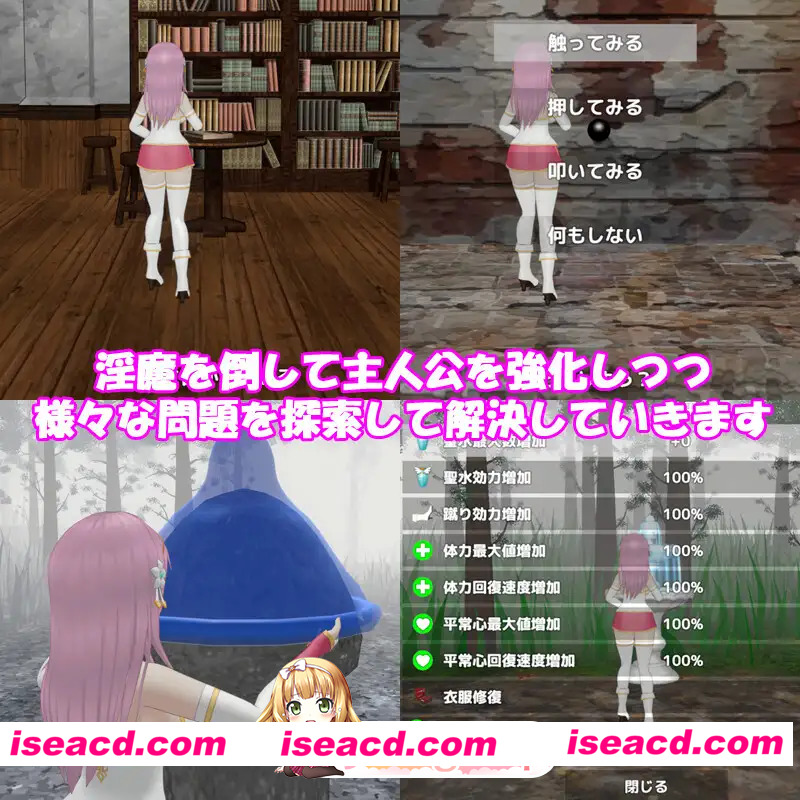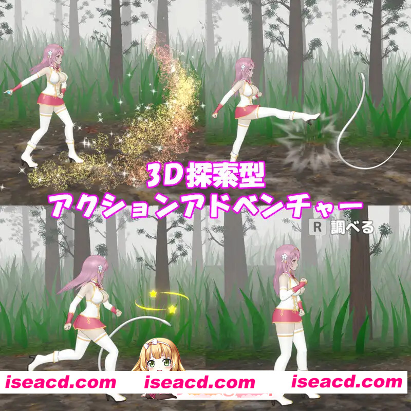 ■游戏类型探索型3D动作冒险 圣女与淫魔之时 [阿伽西之魂] 通过「圣水」「踢击」「回避」三种简单操作展开攻略 「圣水」…可净化淫魔 「踢击」…既能与敌人拉开距离,也可使敌人昏迷 「回避」…可避开昏迷等特定状态下的敌人 净化淫魔后可获得「被净化的灵魂」 通过收集灵魂可强化主人公能力,使冒险更有利