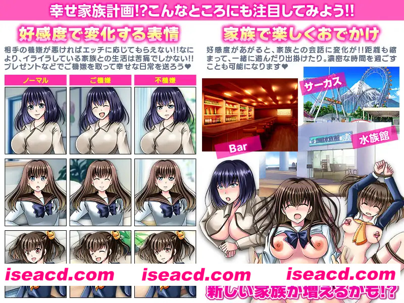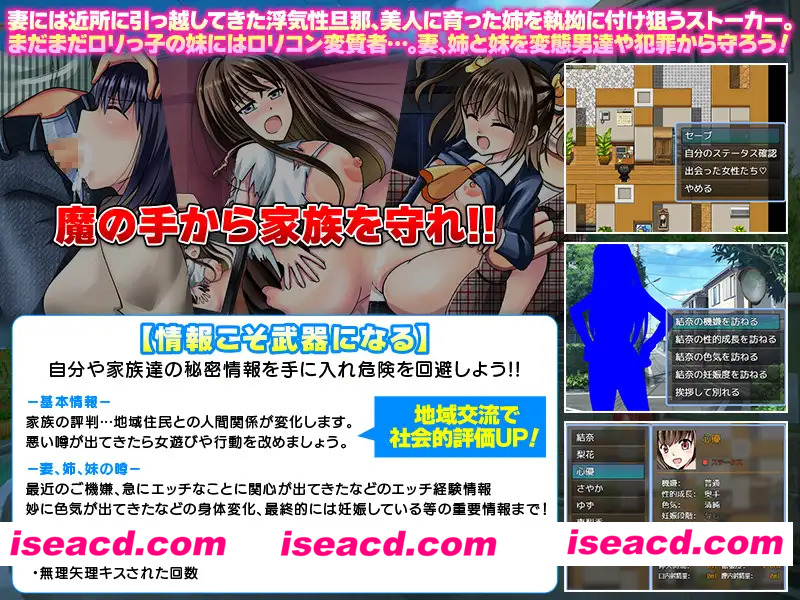 <秘密隐藏要素>有将姐姐、妹妹彻底过度保护抚养长大的近亲相○路线哦WW [与妻子的夜生活] 当然女儿们都熟睡后妻子会在床上等待 根据心情状态有时也会拒绝色色! 因为可能会怀孕所以色色要计划进行! ■心情系统■赠送室内装饰或玩偶等装饰品来讨好家人吧! (赠送的物品会实际显示在家里的地图上) (保护家人) 妻子身边有最近搬来的花心邻居丈夫,成长为美女的姐姐身边有执着跟踪的跟踪狂。 还有对萝莉妹妹下手的恋童癖变态…。 保护妻子、姐姐和妹妹免受变态男和犯罪的侵害! [情报才是武器] 获取自己及家人的秘密情报回避危险吧 -基本信息-家人的风评…与地区居民的人际关系会发生变化 如果出现不好的传闻就改善寻花问柳的行为吧 -妻子、姐姐、妹妹的传闻- 最近的心情、是否突然对色色事情产生兴趣等色情经历信息 莫名变得妩媚等身体变化、最终是否怀孕等重要情报! ・胸部被揉捏的次数 ・私处被摸索的次数 ・被强行亲吻的次数 ・被强行将手伸进内衣的次数 ・手被按在阴茎上的次数 (与邻居们的自由恋爱) 话虽如此邻居的女人们也太过令人介意了! 成长为妙龄的邻居女孩、最近搬来的夫妇的年轻妻子。 住在隔壁从以前就关系很好的夫妇的妻子因为丈夫单身赴任似乎欲求不满…。 ■发生性关系全员都有怀孕的可能性■(这孩子是谁的?) 当某人确定怀孕并腹部隆起时需要调查谁是父亲 妻子的身孕希望是我的。 祈祷邻居的出轨对象不是自己。 更何况女儿、妹妹她们…。